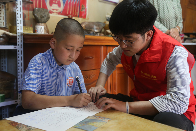 三下乡的过程中,在走访了琥珀乡内大多数的村民后,志愿者们发现村内外出务工人员数量较多,因此,村内的儿童大多由家中老人照看,同时也的确存在家长无心照看孩子的现象。在村内的走访调查中,许多老人向队员反映自己识字不多,无力辅导孩子的假期作业;同时两代人年龄差距较大,在管理孩子方面也是“心有力而余不足。” 在随后几天的志愿工作中,志愿者们对琥珀乡内的留守儿童进行课业辅导,组织一些互动小游戏,寓教于乐,让这些留守儿童们在学习到知识的同时,还能获得陪伴和欢乐。