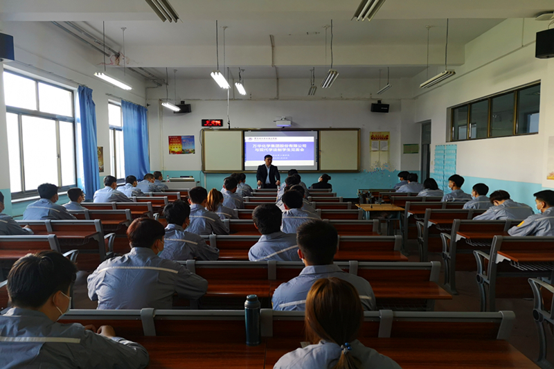 会上,万华集团(烟台)人力资源部白朔副主任从关于我们、发展历程、企业文化、主要产品、工作环境、薪资待遇及发展平台等方面对万华化学集团股份有限公司进行了全面介绍。万华181班班长陈明同学代表万华现代学徒制181班员工进行了发言,保证会坚持不懈地努力学习,早日成为优秀的万华人。随后,白朔和与会员工就个人发展、薪资待遇及住宿条件等进行了交流。最后,应用化学工程经理侯侠进行了总结发言,对万华化学集团股份有限公司领导的到来表示了热烈的欢迎,对校企双方共同培养出高技能人才充满信心,并要求员工在校期间能够努力学习、提高技能、强健体魄,为进入企业工作打下良好的基础。